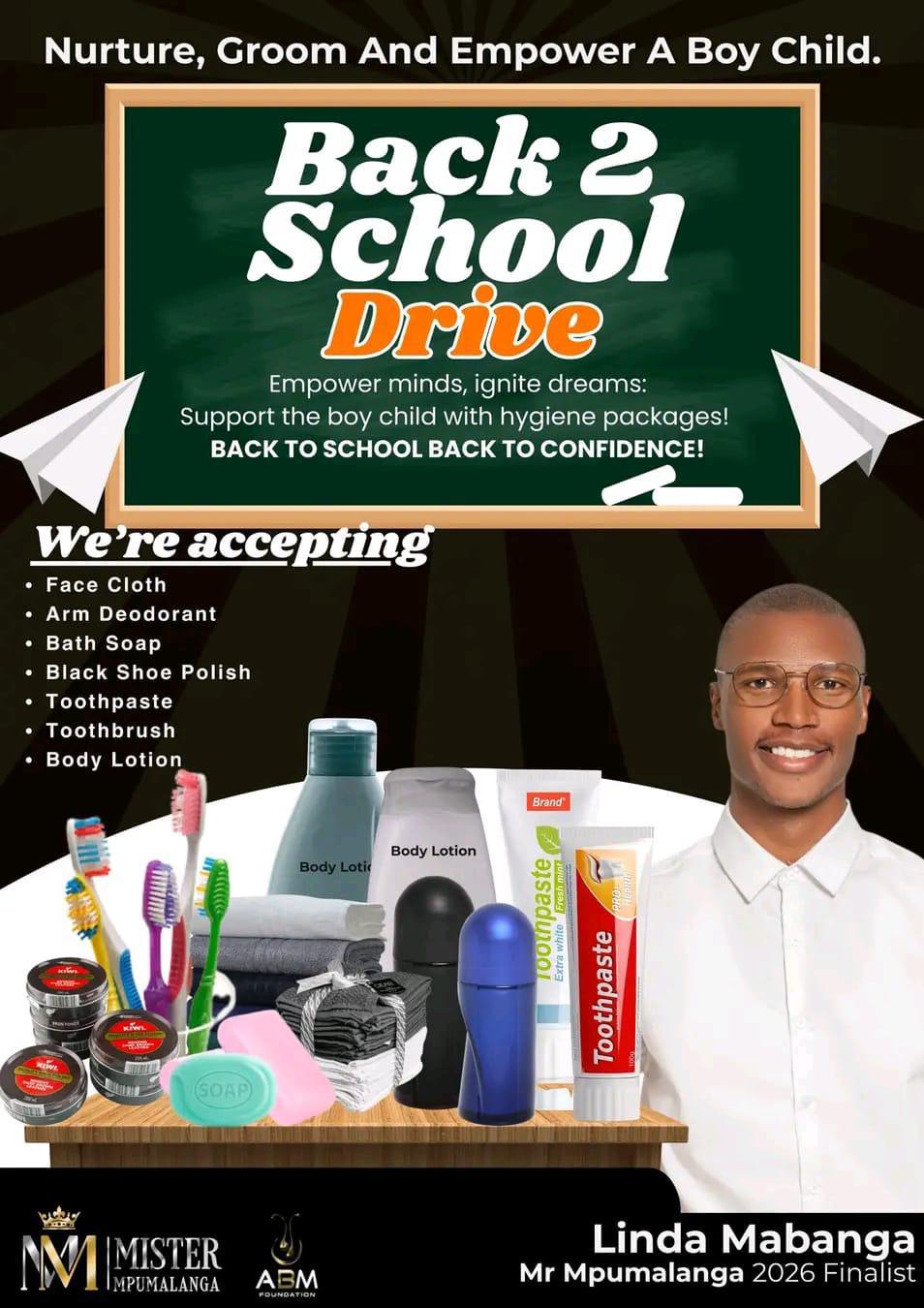 As part of the Mr Mpumalanga competition, all finalists have been tasked with running a community campaign. Mabanga is leading a back-to-school dignity drive for young boys, collecting toiletry items such as toothpaste, lotion and deodorant to create dignity packs for learners in need.