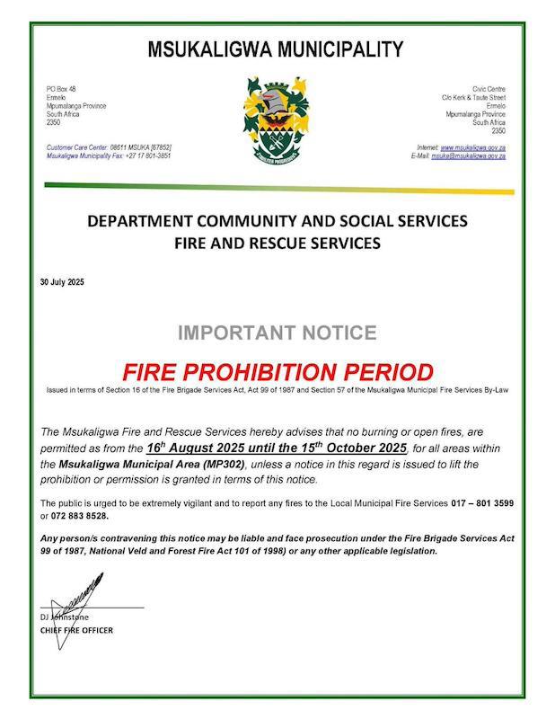 The Msukaligwa Municipality’s Fire and Rescue Services has issued an official fire prohibition notice, effective from 16 August to 15 October 2025. The ban applies to all areas within the Msukaligwa Local Municipality (MP302) and is aimed at preventing the outbreak and spread of veld and structural fires during the region’s high-risk dry season.