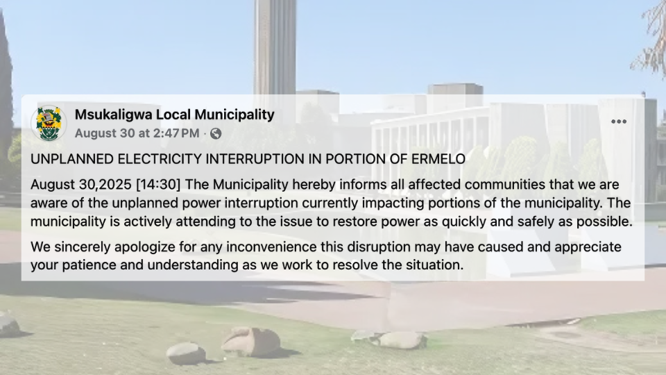 Large parts of Ermelo were left without electricity from Friday afternoon until late Sunday afternoon, following an unplanned outage that the Msukaligwa Local Municipality only acknowledged publicly on Saturday, 30 August. In a brief statement posted on its official Facebook page, the municipality confirmed that portions of the town were affected and that technicians were working to restore supply “as quickly and safely as possible.”