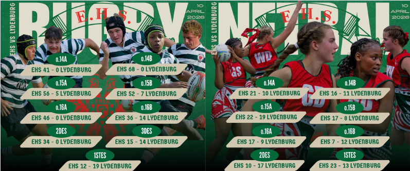 Hoërskool Ermelo’s sporting teams delivered a strong set of performances across rugby, netball, and hockey fixtures played on 10 April 2026 against Lydenburg.