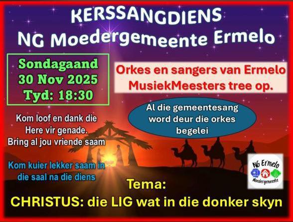 NG Moedergemeente Ermelo is vanaand, Sondag 30 November 2025 om 18:30, besig om hul jaarlikse Kerssangdiens aan te bied. Gemeentelede en besoekers is saam aan die sing en loof, terwyl die orkes en sangers van Ermelo MusiekMeesters live optree.
