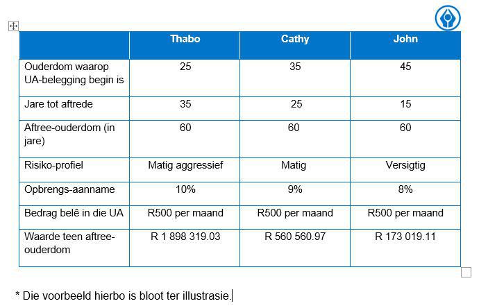 behoeftes, leefstyl en risiko-aptyt oor tyd. Die tabel hieronder illustreer aftree-uitkomste vir beleggers wat R500 per maand tot ʼn UA bydra.*