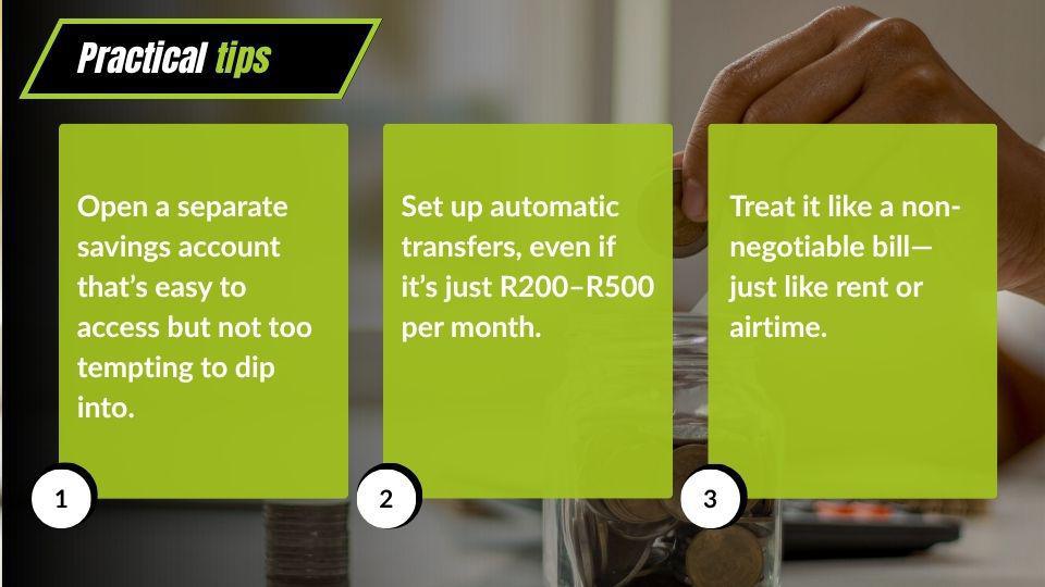 - Set up automatic transfers, even if it’s just R200–R500 per month.