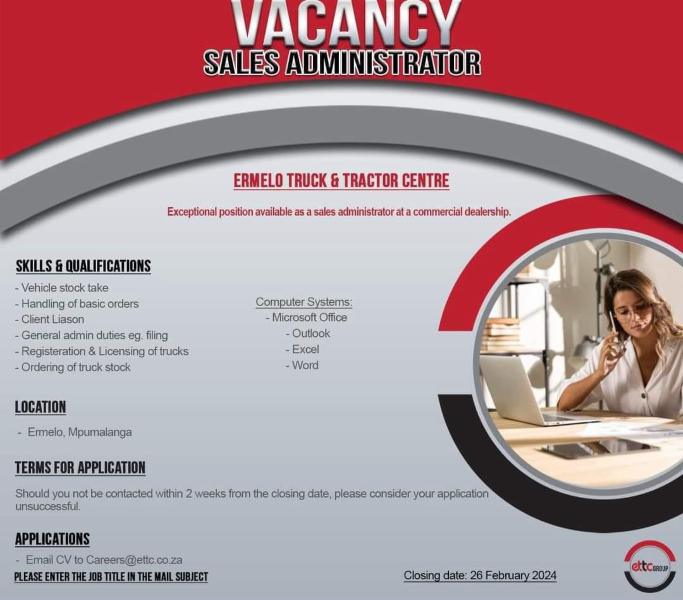 Ermelo Truck & Tractor Centre (ETTC) seeks dynamic individuals to fill two critical positions within their esteemed organization. The vacancies, a Debtors/Banking Clerk and a Sales Administrator offer promising career paths within the commercial dealership sector.