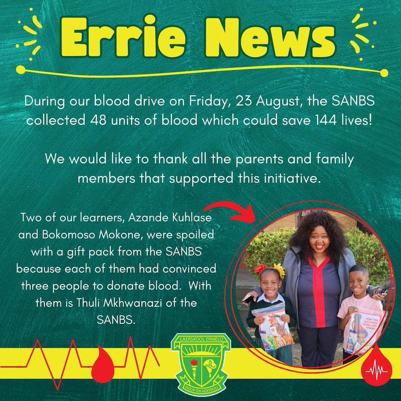 On Friday, 23 August, Laerskool Ermelo hosted a blood drive in partnership with the South African National Blood Service (SANBS). The event was a huge success, collecting 48 units of blood, potentially saving up to 144 lives.