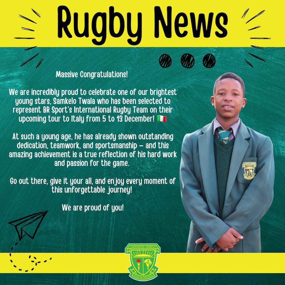 Massive local pride as young rugby star Samkelo Twala from Ermelo gets the call-up to join BR Sport’s International Rugby Team for their upcoming tour to Italy from 5 to 13 December!