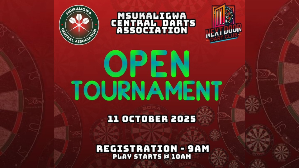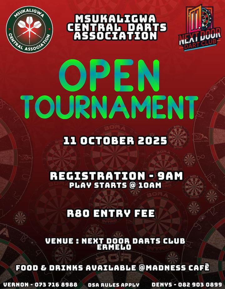 The Msukaligwa Central Darts Association, in collaboration with the Next Door Dart Club, will be hosting an Open Darts Tournament on Saturday, 11 October 2025, at the Next Door Darts Club in Ermelo. Darts enthusiasts from across the region are invited to take part in what promises to be an exciting day of friendly competition and community spirit. Registration kicks off at 9:00 AM, with play starting at 10:00 AM, and an entry fee of just R80 per player.