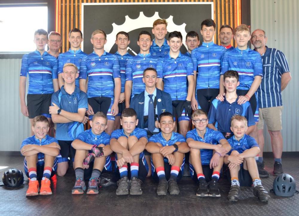 Foto: Die Ligbron Fietsryspan met hul afrigters Mnr Theunis Botha (links agter) en Mnre Duane Purcocks en Grovè Eksteen (regs agter) in hul nuwe klubhuis.