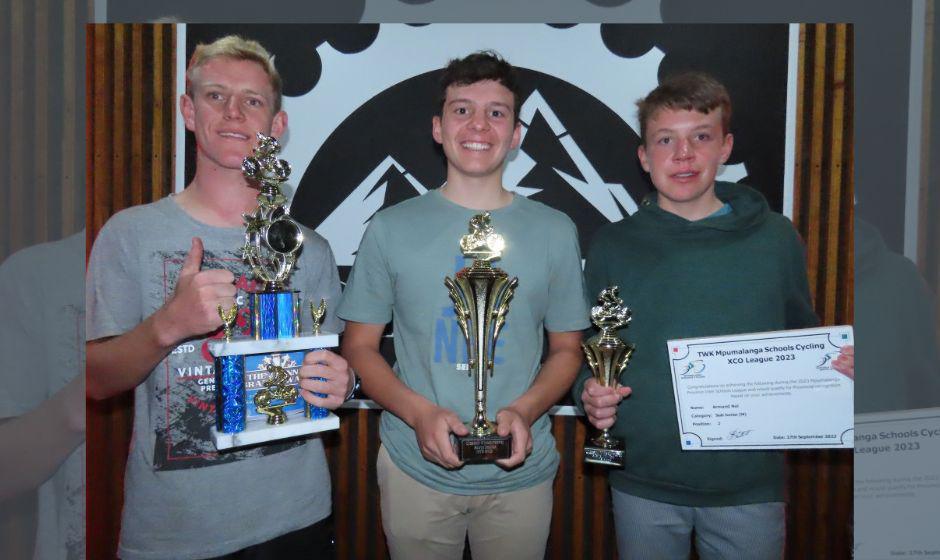 Foto (vlnr): Conrad Coetzer het ‘n trofee ontvang vir die beste vordering in die sport deur die jaar, Ian Swart is aangewys as die beste senior MTB fietsryer en Armand Swart is die beste junior MTB ryer.