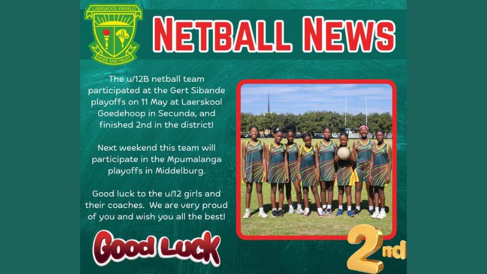 Laerskool Ermelo's u/12B netball team performed exceptionally well at the Gert Sibande playoffs held on 11 May 2024 at Laerskool Goedehoop in Secunda, finishing second in the district.