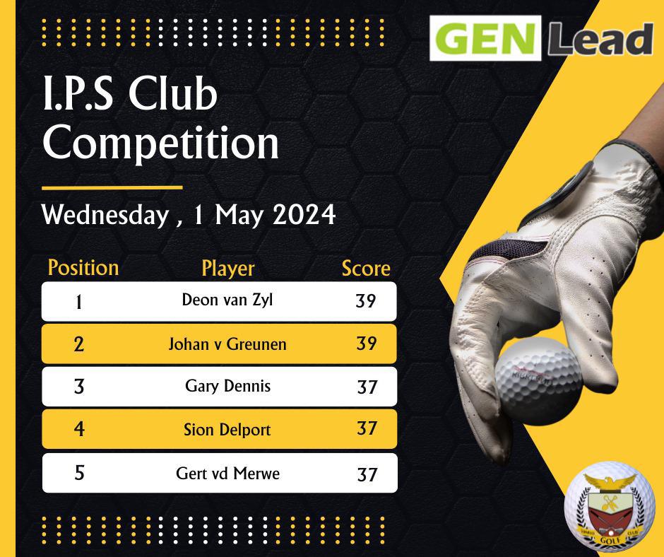 On Wednesday, 1 May, the I.P.S. Club Competition took the spotlight, where local golfers competed in a stroke-play format. Deon van Zyl and Johan v Greunen tied for the top spot, each carding impressive scores of 39. Close on their heels were Gary Dennis and Sion Delport, who shared the third position with scores of 37, followed by Gert vd Merwe, rounding out the top five.