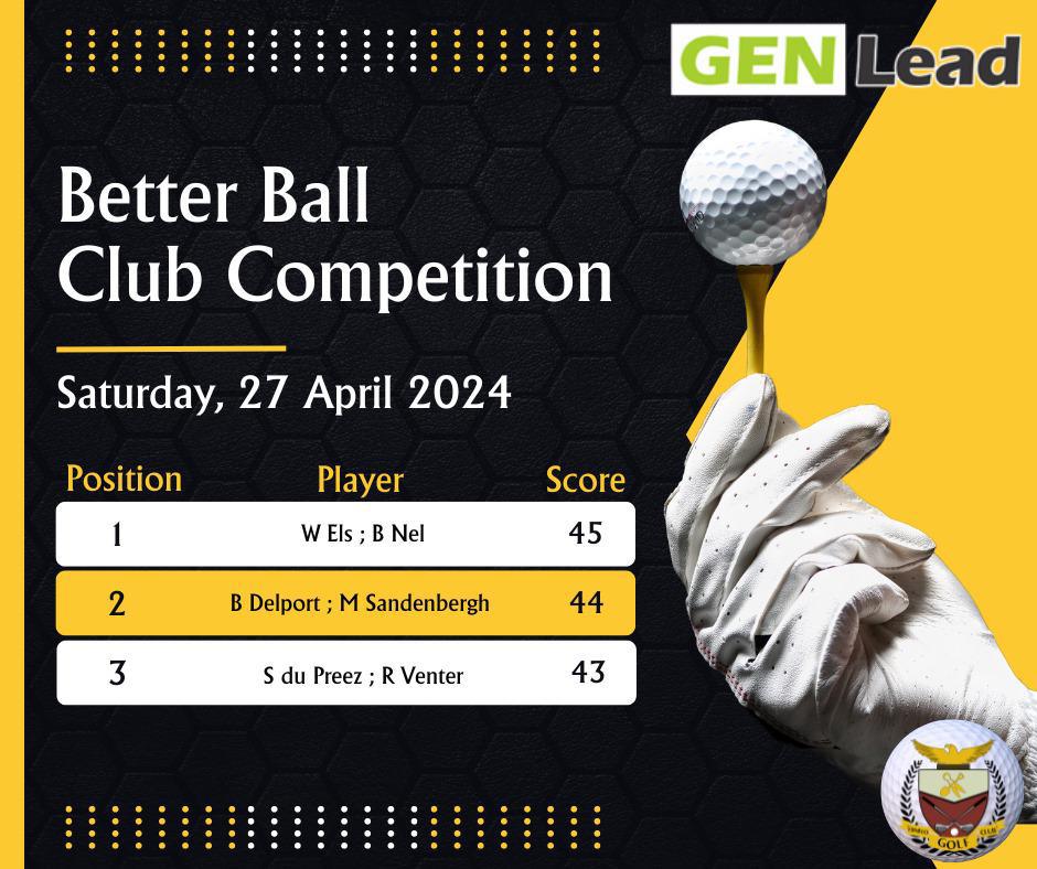 On Saturday, 27 April, the club hosted the Better Ball Club Competition. This event featured pairs of golfers combining their efforts to post the best score. W Els and B Nel emerged victorious with a score of 45. The runner-up spot was closely contested, with B Delport and M Sandenbergh just a stroke behind at 44. S du Preez and R Venter claimed third place with a commendable score of 43.