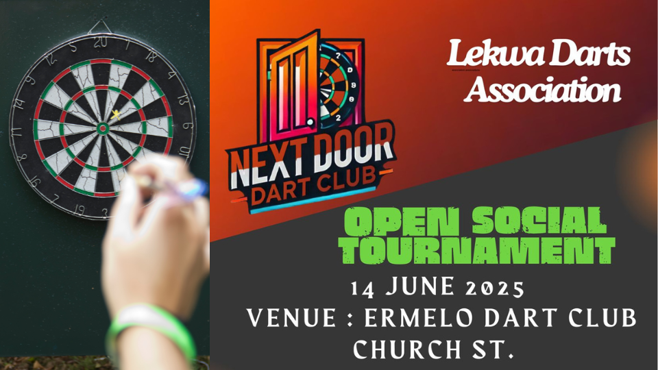 The Lekwa Darts Association, in partnership with the vibrant Next Door Dart Club, will be hosting an Open Social Tournament on 14 June 2025 at the club’s premises on Church Street, Ermelo. Registration opens at 10:00 AM, with matches starting promptly at 11:00 AM. Players are encouraged to dress casually — but take note: no flip-flops allowed.