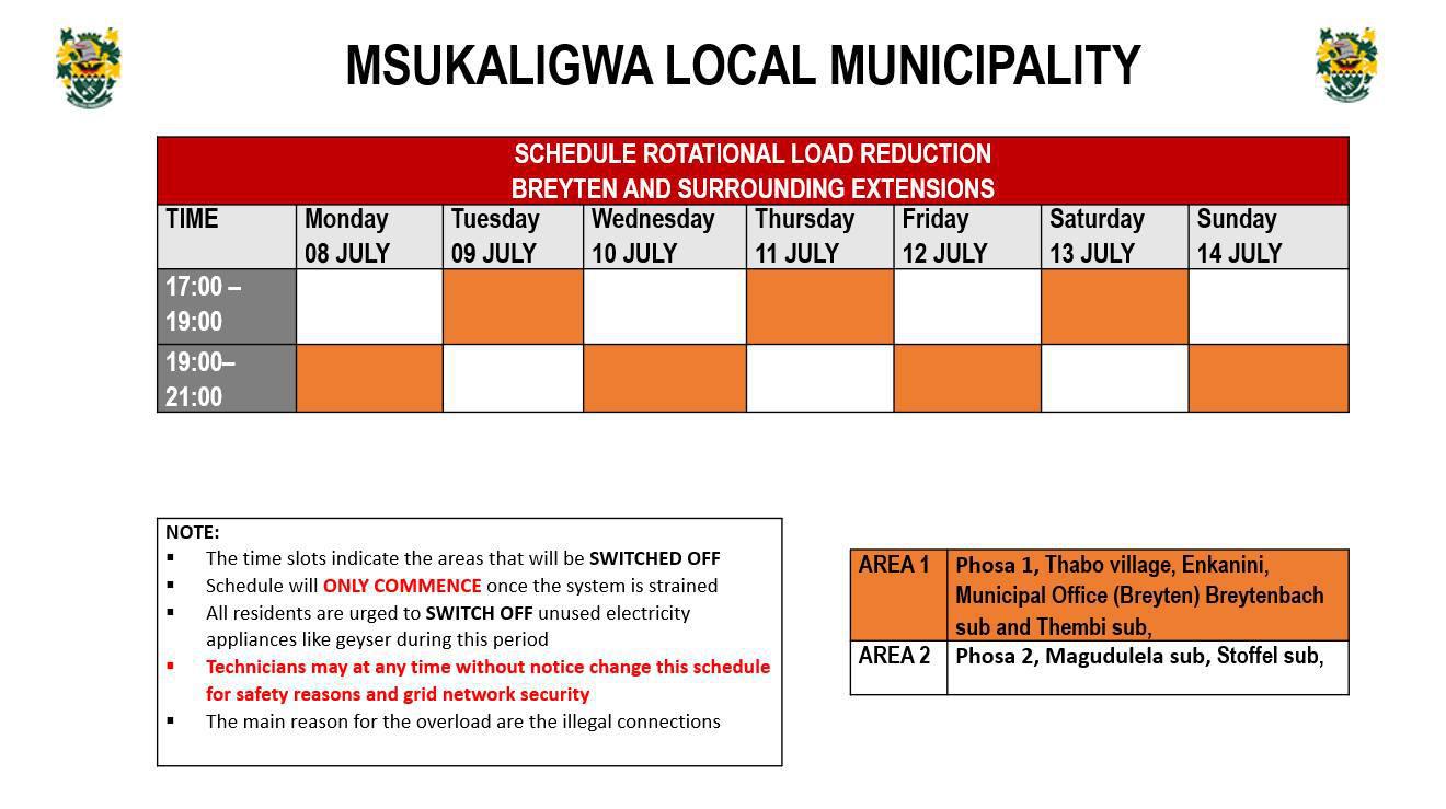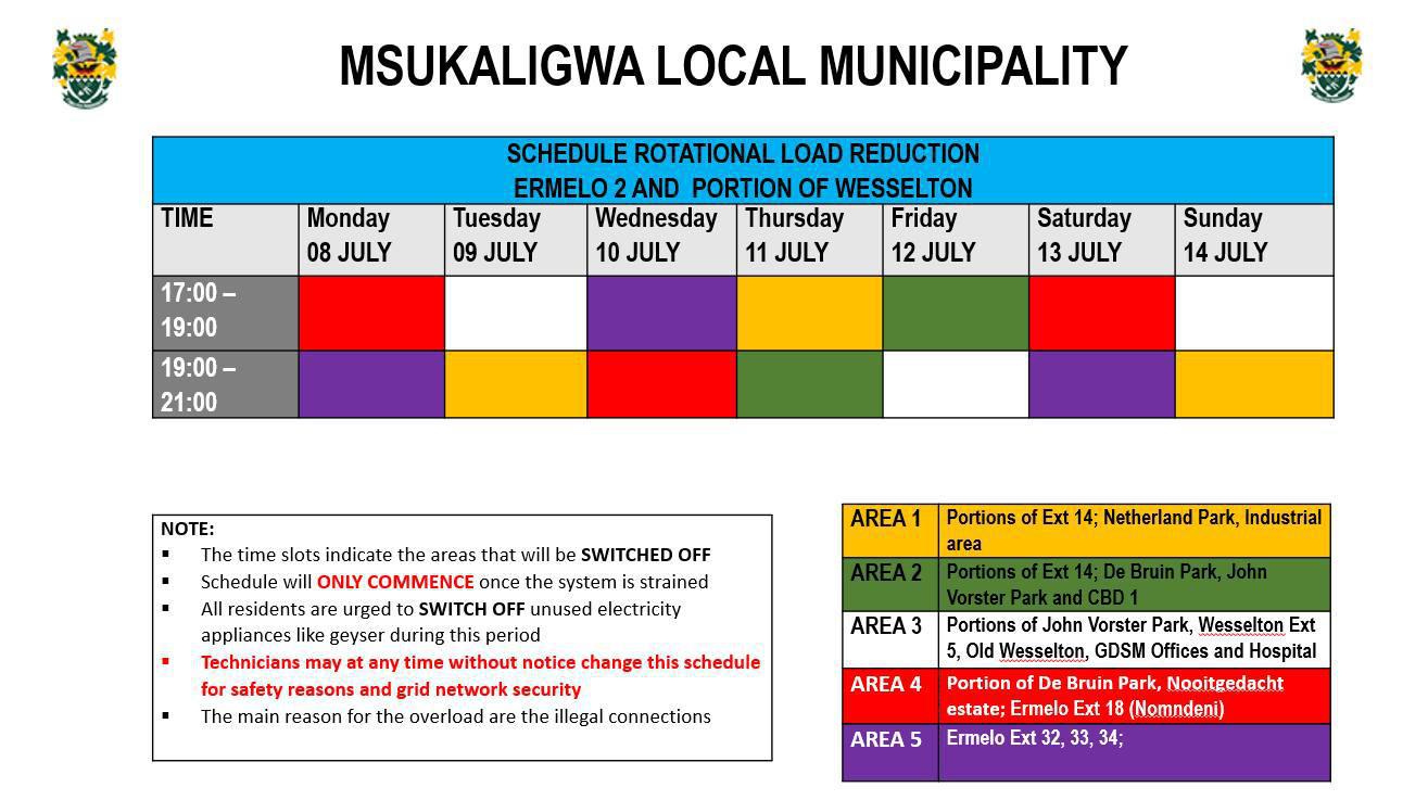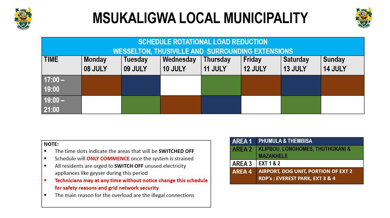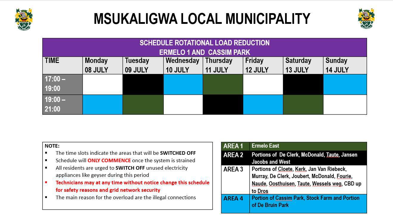 Msukaligwa Local Municipality's schedule for rotational load reduction (8 - 14 July 2024)