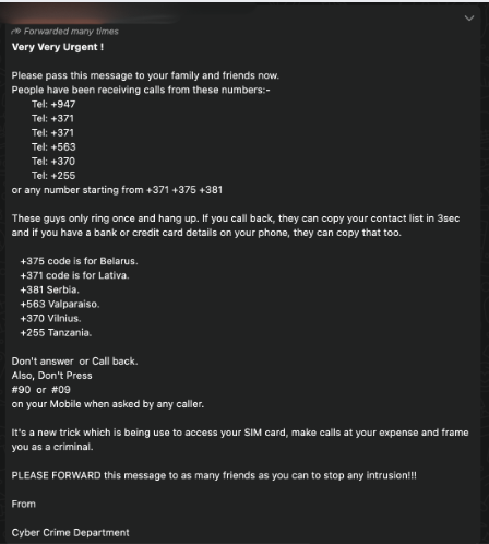 The message, which has been circulating globally in various forms since at least 2012, claims that callers from foreign country codes ring once and hang up, and that returning the call allows criminals to copy personal data within seconds. It also warns users not to press certain keypad combinations, alleging it could give criminals access to a person’s SIM card.