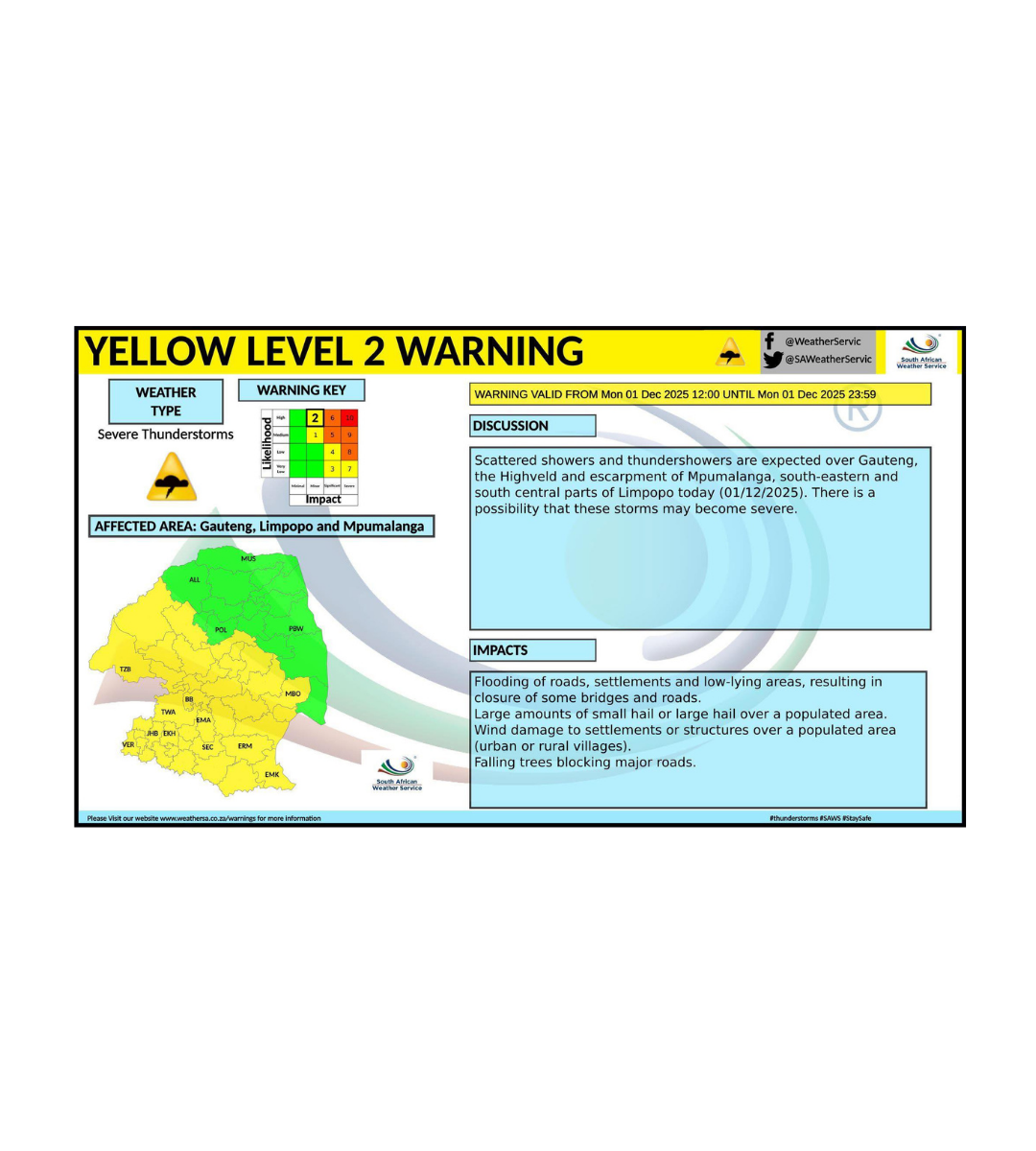 The South African Weather Service has issued a Level 2 warning for severe thunderstorms expected across parts of Gauteng, Limpopo, and Mpumalanga — including Ermelo and the greater Msukaligwa area — on Monday, 1 December 2025, from 12:00 to 23:59.