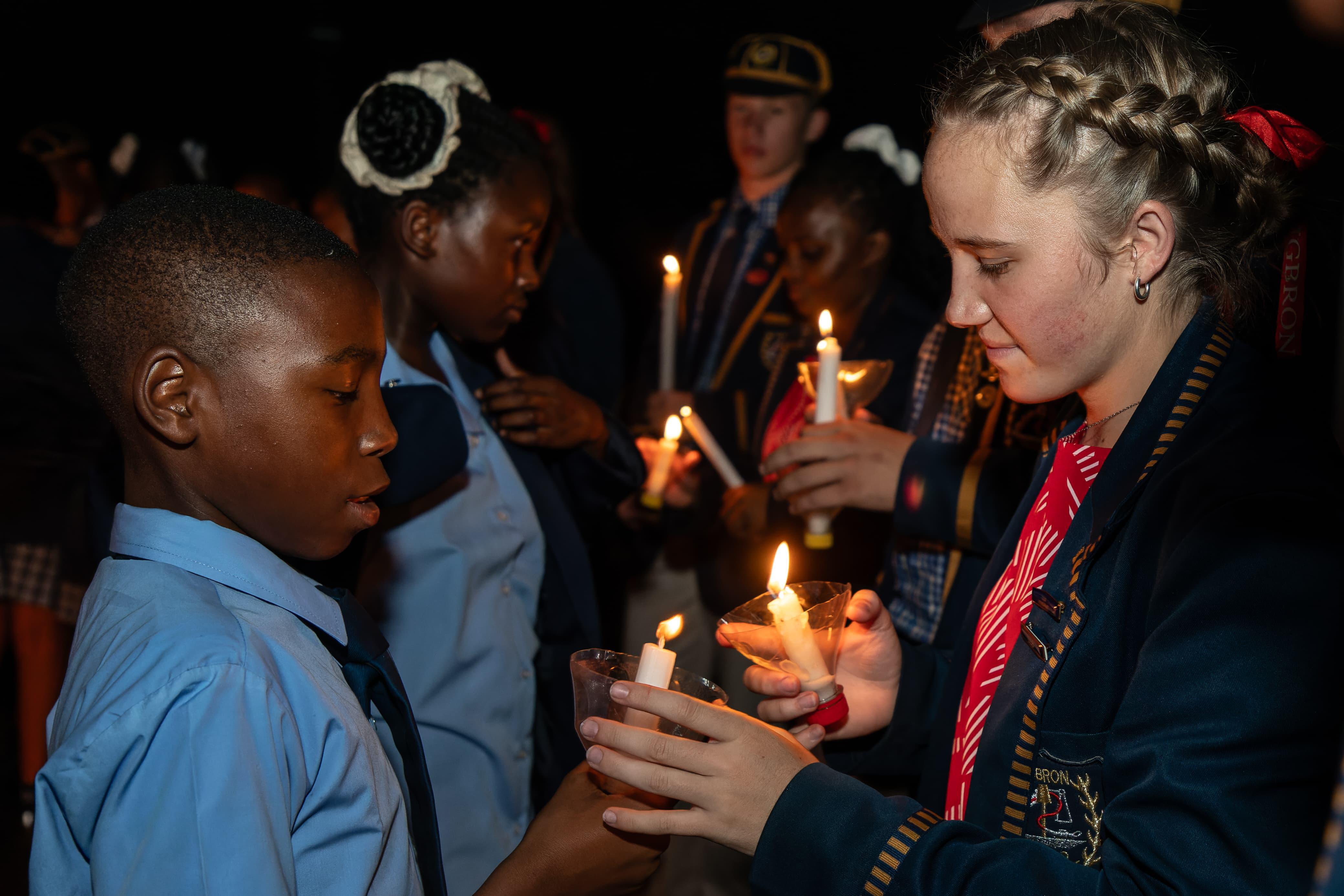 Mnr Gerhard Brand steek die kandelaar aan van waar die leiers en graad 8s se kerse aangesteek word